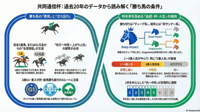 以下は、共同通信杯(過去20年・全出走馬ベース)を、指定の8観点で「事実 → 解釈 → 斬新な結論」の3段で整理したものです。1. 前走レース別の傾向(クラス/格も含む)データの事実 勝ち馬は「前走が重賞(G3/G1)」からだけでなく、1勝...