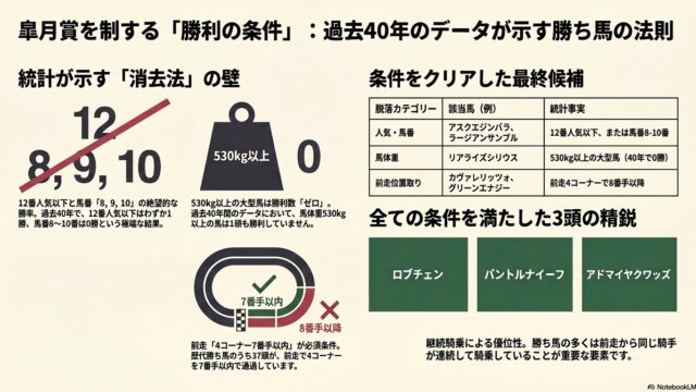 【皐月賞】過去40年のデータが突きつける「勝ち馬」の絶対条件:生き残った3頭とは?1. 歴史という名のフィルター競馬という不確定要素の塊において、我々が唯一縋ることができるのは「積み上げられた事実」のみである。特にクラシック三冠の幕開けを飾...