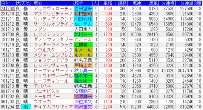 阪神ジュベナイルフィリーズの配当一覧(出目)