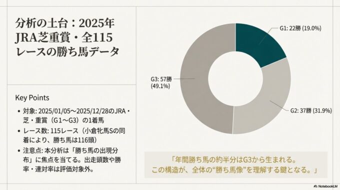 G3が約半分。年間の“勝ち馬像”を歪めやすいのは、ここにハンデ戦が大量に含まれるからです(後述)。