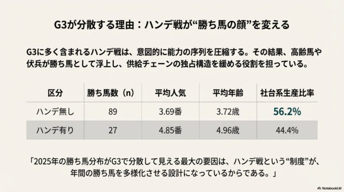 • 2025の勝ち馬分布がこうなった最大要因は、G3ハンデが年間の勝ち馬を大量生産する設計にある