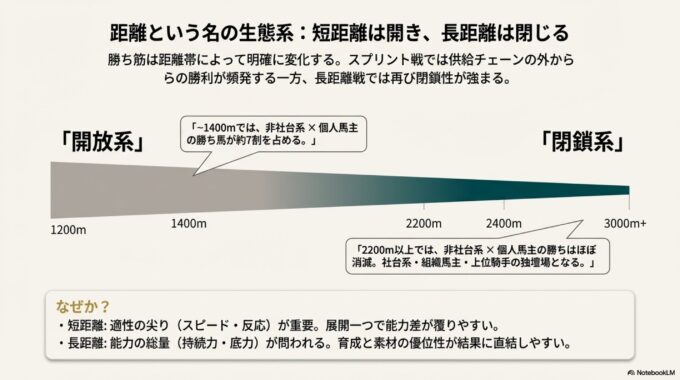 長距離は「能力の総量(持続・底力)」が問われ、相対的に“育成と素材”の寄与が増えて、供給チェーンが勝ち馬を回収しやすい。