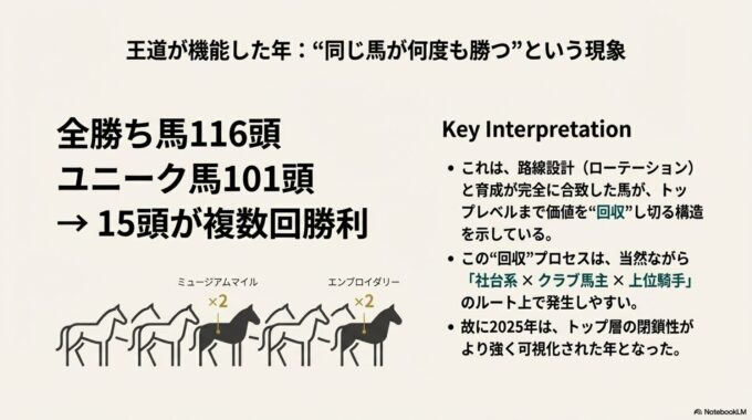 この4層が同時に成り立つと、「2025の勝ち馬分布」は自然に今の形になります。