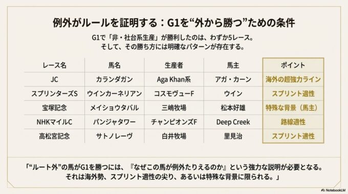 8. 例外(G1でルート外から勝つパターン)は少数で、条件がはっきりしている