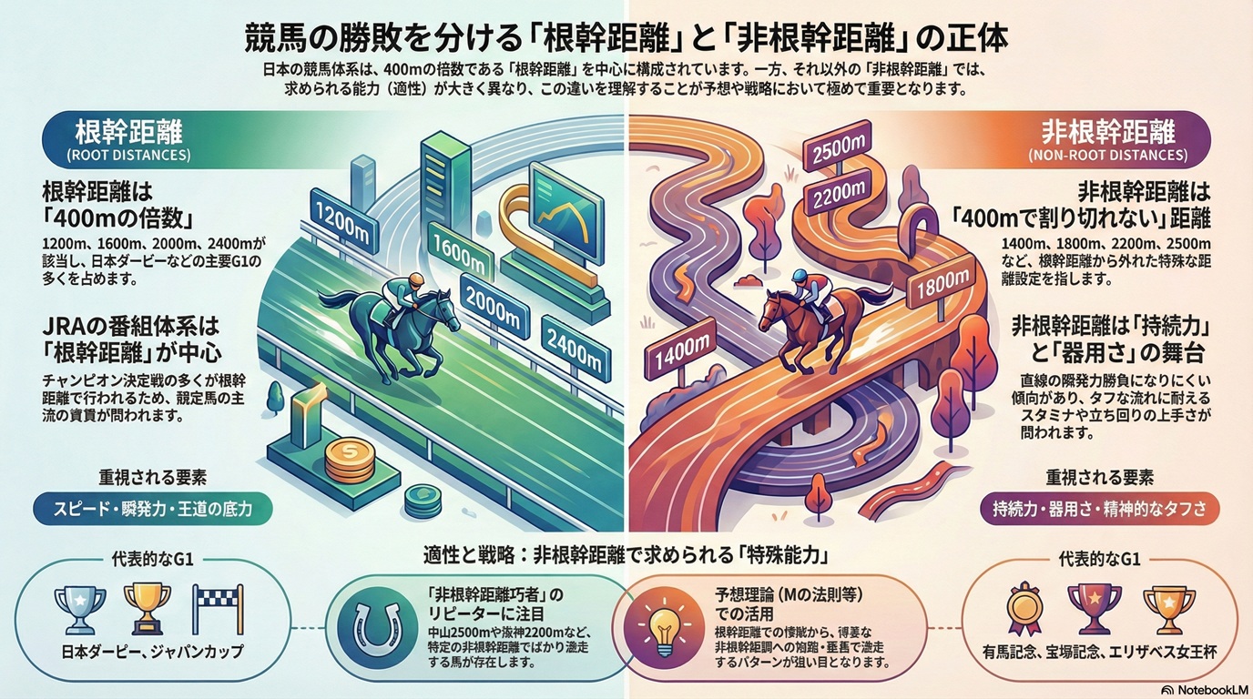 根幹距離とは、一般に1200m、1600m、2000m、2400mといった400m(2ハロン)で割り切れる距離を指す 。これらの距離は、世界の競馬史において「チャンピオンシップ」を決定するための基準として確立されてきた。特にマイル(1600m)を基準点とし、その延長線上にクラシックディスタンス(2400m)やインターミディエイト(2000m)が配置されている 。