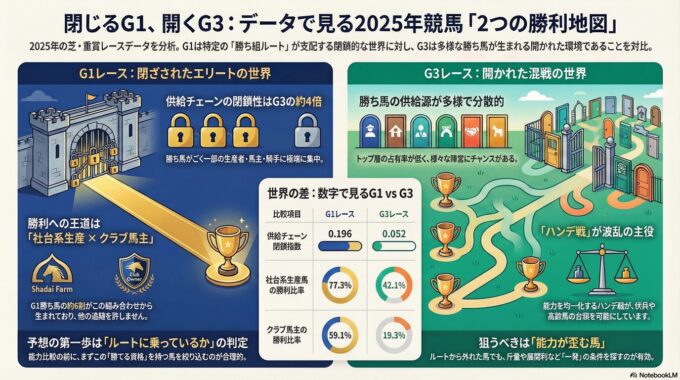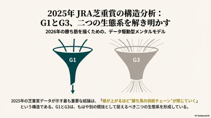 本白書の中心的な主張は、2025年の芝重賞が、レースの格に応じて「勝ち馬の供給チェーン」が閉鎖性を強めることで、「G1の閉鎖的な生態系」と「G3の開放的な生態系」という、本質的に異なる二つの世界に分かれているという点にある。この構造を理解することこそが、現代競馬の核心に迫る鍵となる。