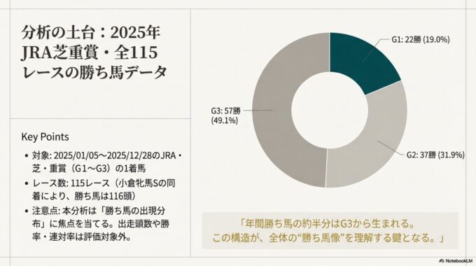 このレポートは、2025年に行われたJRA芝重賞の勝ち馬データという単一のデータセットを俯瞰的に分析することで、多くの予想家が陥りがちな「G1とG3の混同」や「距離による性質の違いの無視」といった罠の正体を構造的に解き明かし、2026年の予想戦略を根本から再定義する『勝ち筋の地図』を提示する。