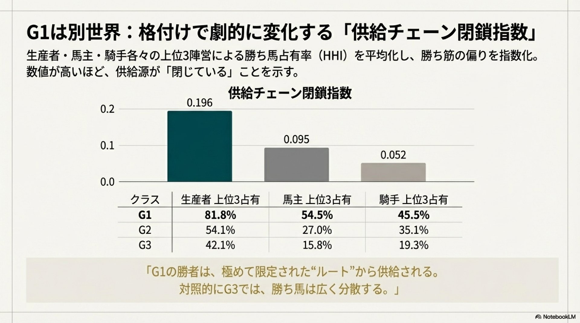 この分析から導き出される結論は明白だ。G1とG3は同じ「重賞」というカテゴリにありながら、その勝者を決定するメカニズムが根本的に異なる。G1は一部の有力な供給源から勝ち馬が生まれる閉鎖的なシステムであり、G3はより多様な供給源が参入可能な、分散しやすい開放的なシステムなのである。