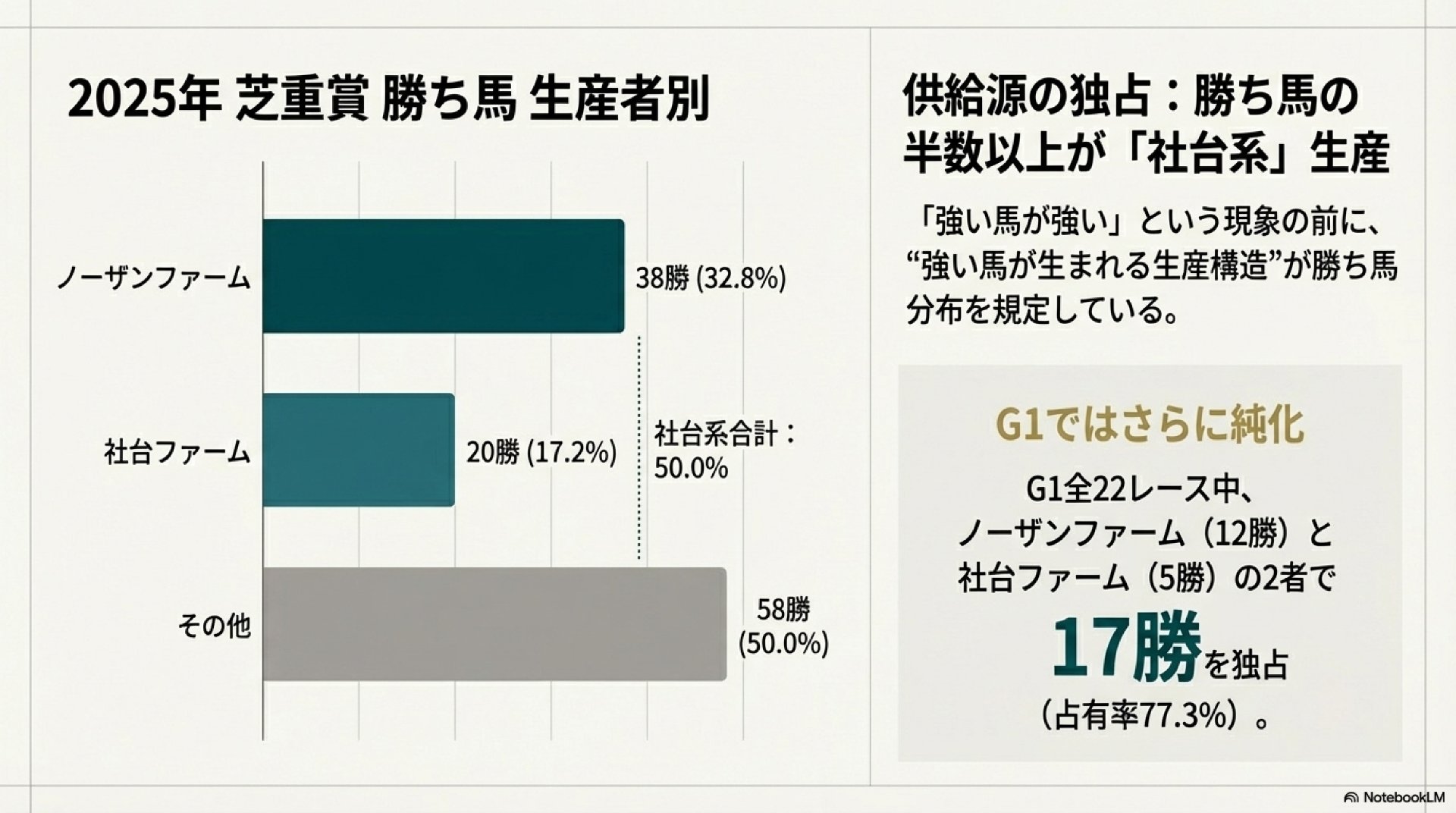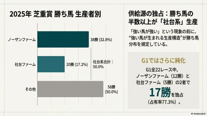 2025年のG1レース全22戦のうち、実に17勝がノーザンファーム(12勝)と社台ファーム(5勝)の2者によって占められた。これは単に「強い馬が勝つ」という事実を追認するものではない。その前段階として、「強い馬が生まれる生産構造」そのものが、勝ち馬の分布を規定しているという、より本質的な構造を示唆している。最高峰の舞台で勝つための素質は、レースが行われるずっと以前の段階で、特定の生産者に著しく偏在しているのだ。