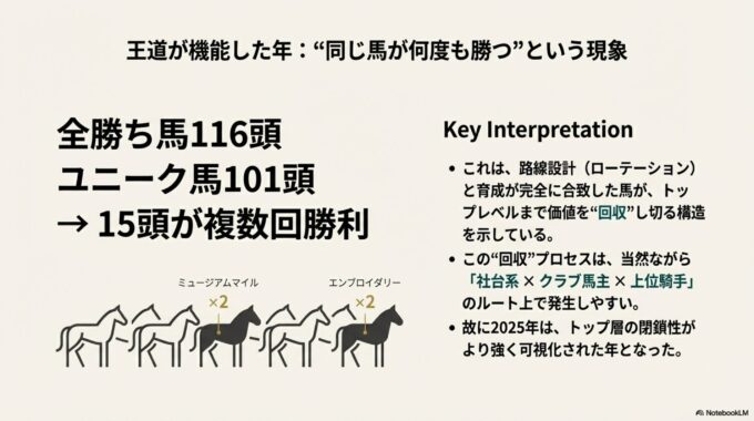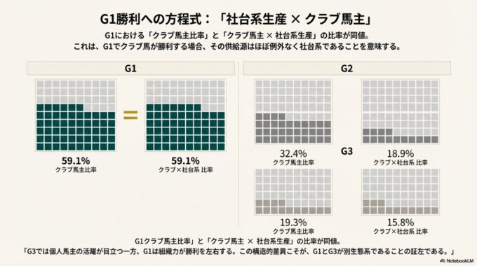 このテーブルが示す最も重要な事実は、G1において「クラブ馬主比率」と「クラブ×社台系」の数値が59.1%で完全に一致する点である。これは、2025年のG1においてクラブ法人が所有する勝ち馬は、一頭の例外なく社台系生産馬であったことを意味する。これこそが、G1という舞台における供給チェーンの排他性を示す、最も強力な証左である。