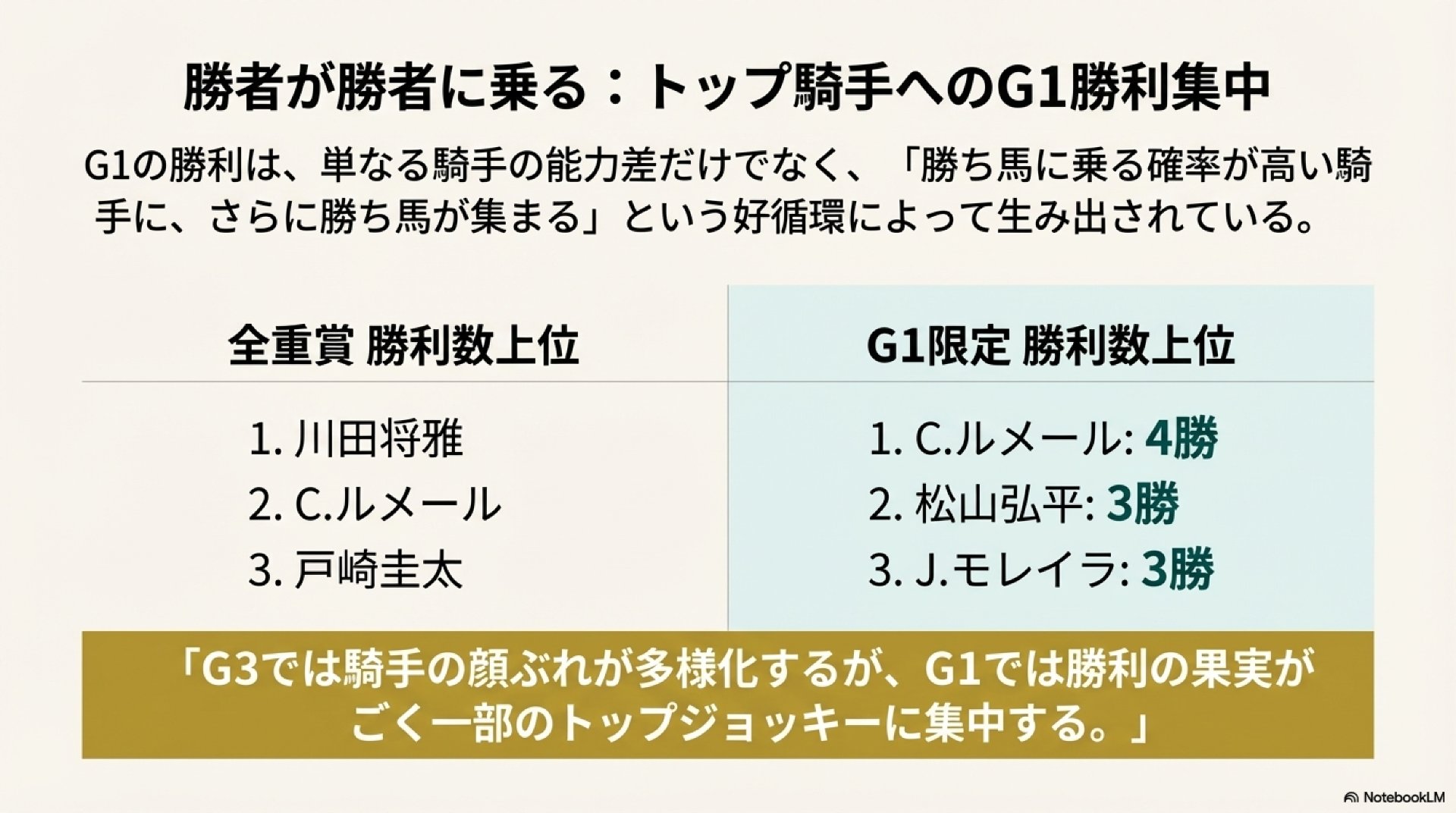 - 第三層:実装(騎手) 「勝てる馬に有力騎手が乗る」という自己強化ループは、G1という最高の舞台で最も強く働き、勝ち馬の集中を加速させる。