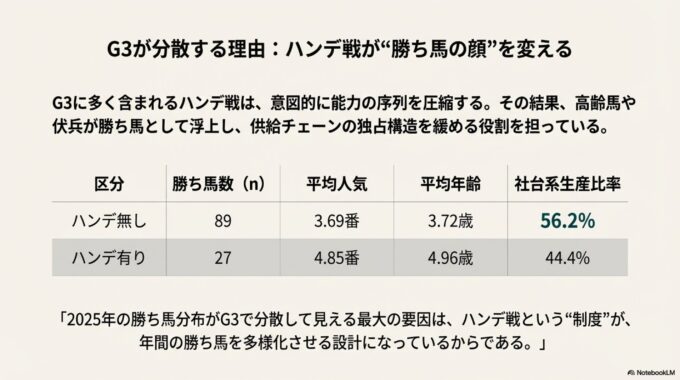 このデータから、ハンデ戦は明確に勝ち馬の平均人気を下げ(=波乱が起きやすく)、平均年齢を上げる(=キャリア豊富な馬にチャンスが生まれる)効果があることがわかる。これは、斤量によって能力の序列が人為的に圧縮されるためだ。その結果、伏兵や実績で劣る高齢馬が台頭する土壌が生まれ、社台系生産馬の比率も低下する。年間の重賞の約半分を占めるG3にハンデ戦が多く含まれることこそ、G3レースが「分散して見える」開放的な生態系を形成する最大の要因なのである。