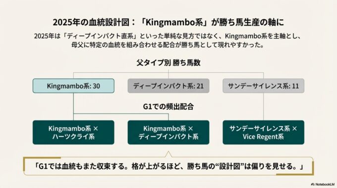 2025年の芝重賞勝ち馬全体の傾向として、父の系統別では「Kingmambo系」が30勝を挙げ最多となった。この数字は、2025年が「Kingmambo系を軸とした年」であったと位置づけることを可能にする。