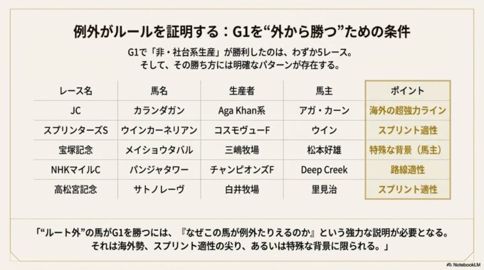 システムの支配的なパターンを理解するだけでなく、その境界線を越える「例外」を分析することこそが、高配当を狙うための戦略的インサイトに繋がる。2025年のG1において、支配的な「社台系生産」というルートの外から勝利を掴んだ馬は、わずか5頭であった。