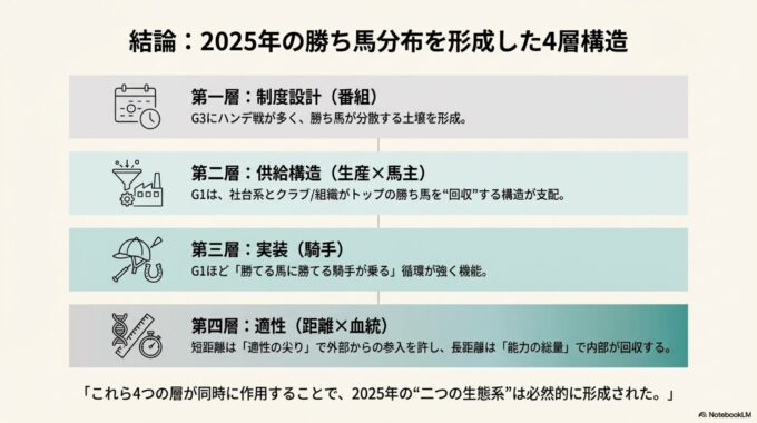 本白書では、2025年のJRA芝重賞データを分析し、勝ち馬の供給構造に根差した新しい分析モデルを提示してきた。このモデルは、2025年の勝ち馬分布がなぜ現在の形になったのかを、以下の4層構造として説明する。