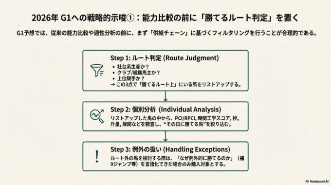 能力比較の前に、まず「勝てるルート判定」を行う。対象馬が「社台系生産か」「組織馬主か」「上位騎手か」というフィルターをかけ、ノイズを排し、勝つ資格のある馬をスクリーニングする。その上で、PCIや展開予測といった詳細な能力分析に進むべきである。