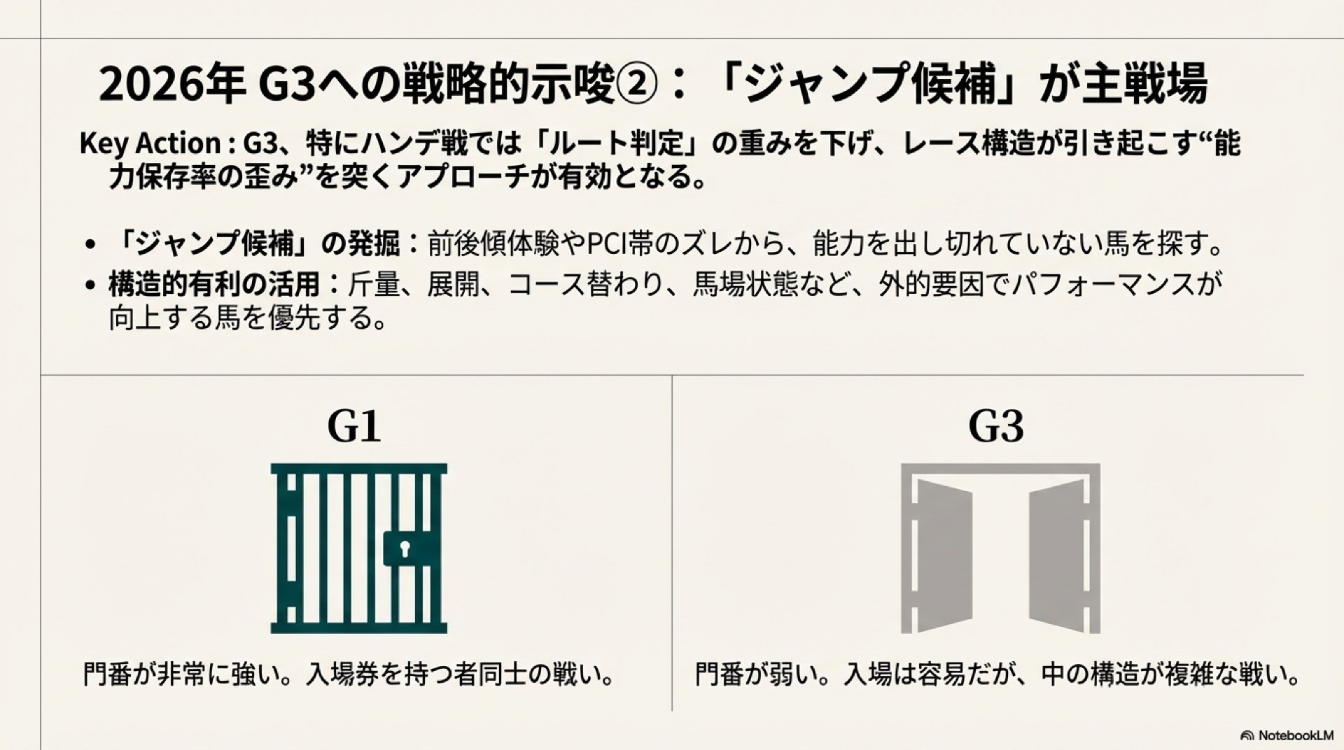 G1とは逆に、「ルート判定」の重要度を下げる。ここでは、斤量、展開、コース替わりといった馬の「能力保存率が歪む条件」に着目し、意図的に作られた非効率性の中に、期待値の高い馬を発掘することに主眼を置くべきである。