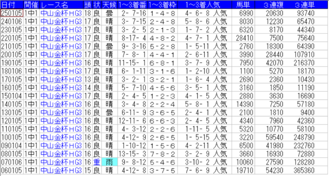 中山金杯の配当一覧(出目)