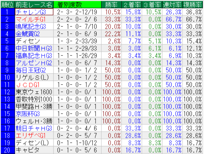 中山金杯の前走レース別成績(上位20位まで)