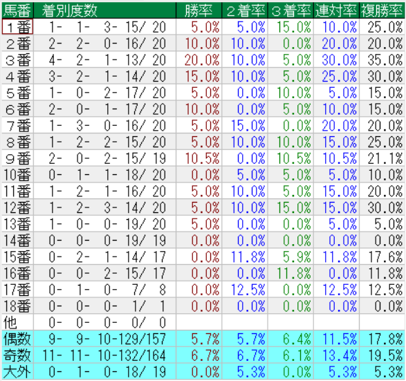 中山金杯の馬番別成績