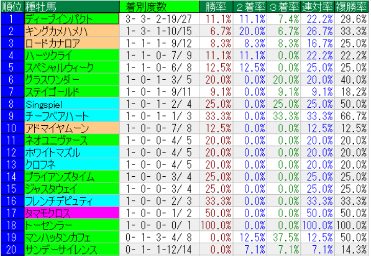 京都金杯の種牡馬系統別成績(上位20位まで)