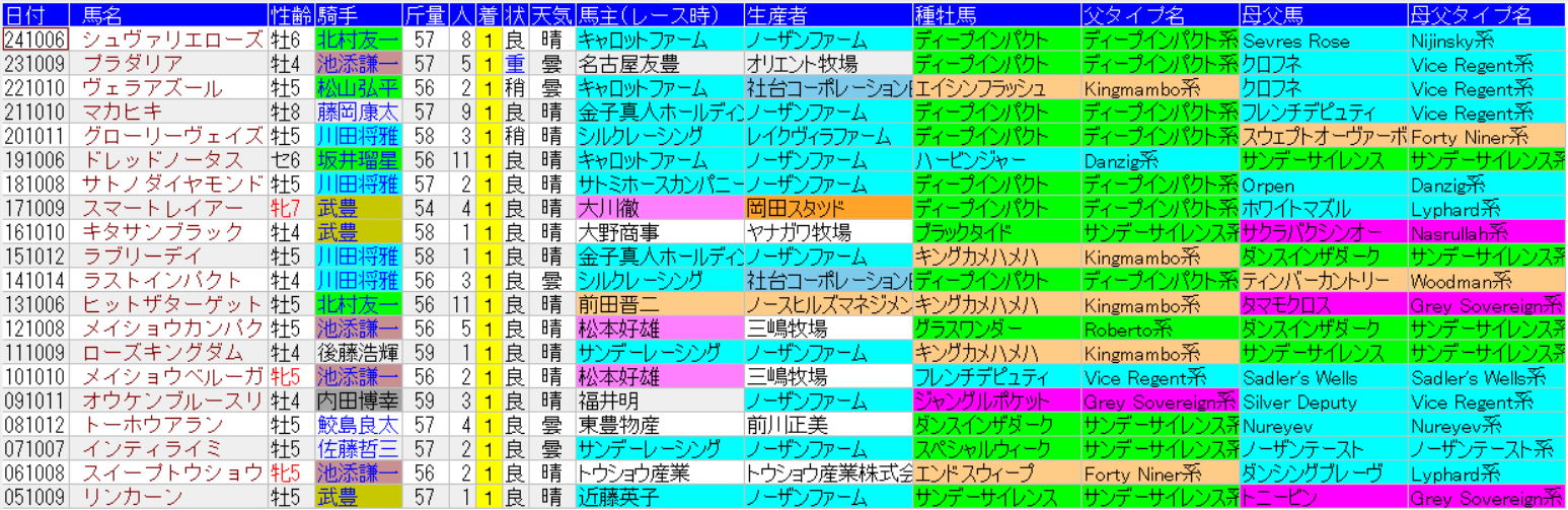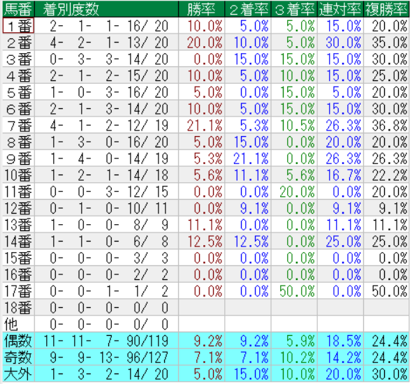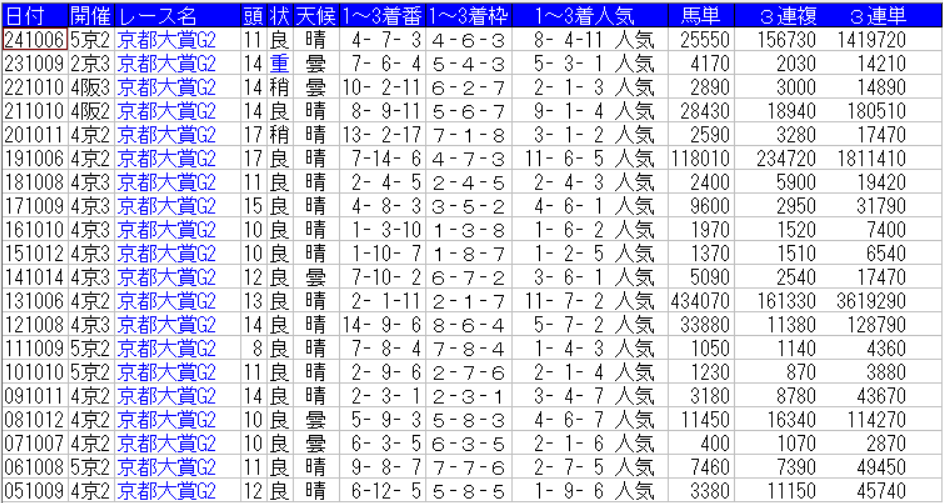 京都大賞典の過去20年の成績を集計し、1着馬の馬データ、1着馬の前走成績、前走レース別成績、血統別(種牡馬)成績、配当一覧など必見データ