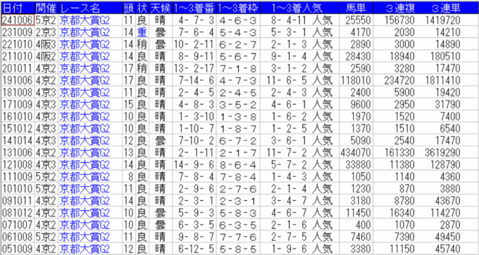 2025年京都大賞典の過去20年のデータ一覧!1着馬の血統別成績や前走成績、配当一覧など、必見の情報を公開