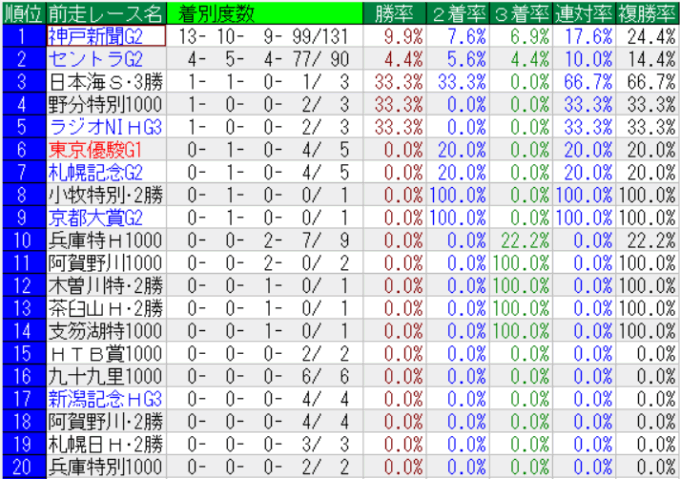 菊花賞の前走レース別成績(上位20位まで)