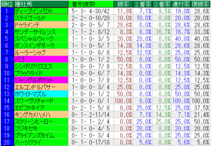 菊花賞の種牡馬成績(上位20位まで)