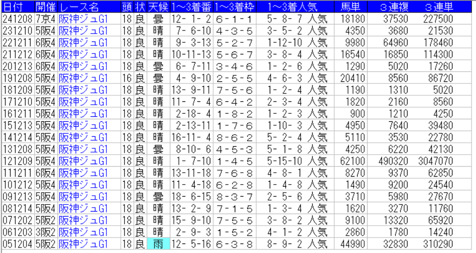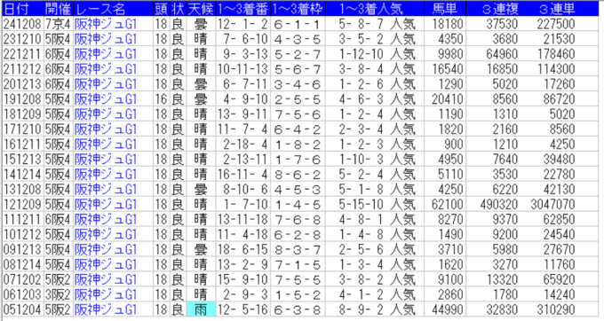 阪神ジュベナイルフィリーズの配当一覧(出目)