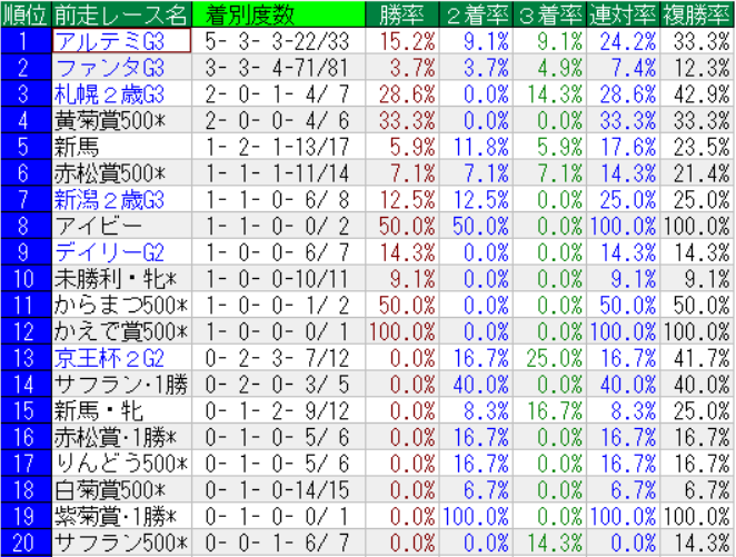 阪神ジュベナイルフィリーズの前走レース別成績(上位20位まで)