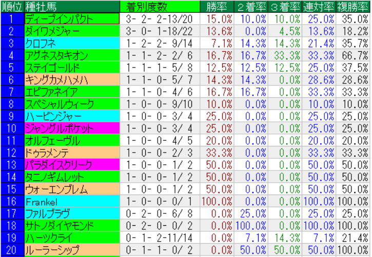 阪神ジュベナイルフィリーズの種牡馬成績(上位20位まで)
