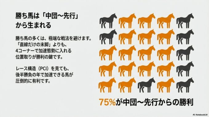 • 勝ち馬に求められるもの: 「完成度の高さ」と「再現性」 勝ち馬の多くは、前走でしっかりと勝ち切るなど、既に高い能力を発揮し、それを再現できる馬です。戦術的には中団~先行でレースを進め、4コーナーでスムーズに加速態勢に入れる器用さが求められます。3歳1月の時点での「完成度」が勝敗を分けるのです。