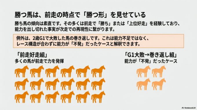 その理由は、G1での敗戦が能力不足ではなく、単に2歳時点での厳しいペースや展開に能力を発揮しきれなかっただけの場合が多いからです。能力そのものを否定する早計な判断は禁物です。