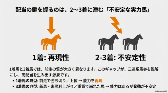 • 2-3着馬に求められるもの: 「伸びしろ」と「不安定さ」 一方、2-3着には前走が新馬・未勝利戦だったり、G1などの重賞で大敗していたりする「能力はあるが、まだ発動が不安定な馬」が穴を開ける傾向にあります。彼らの秘めた「伸びしろ」が、馬券の妙味を生み出します。
