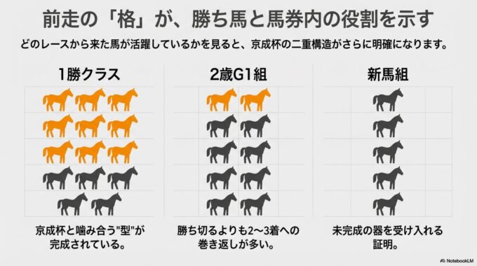 そして、京成杯のようにペースが落ち着きやすいレースに替わることで、本来の能力を発揮し直すパターンが頻繁に見られます。データは、このグループが勝ち切るよりも、2~3着に巻き返す可能性が非常に高いことを示しており、まさに法則1で述べた「伸びしろ」枠の最有力候補なのです。