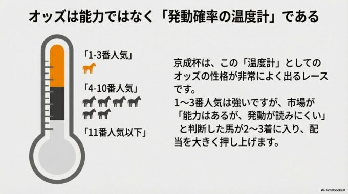 この考え方を応用すると、京成杯の構造がクリアに見えてきます。「能力は高いはずだが、信頼性に欠ける(=発動が読みにくい)」と市場から評価された馬が、その能力をうまく発揮して2~3着に入り、馬券妙味をもたらすのです。この「温度計」の概念は、法則1で提示したレース構造そのものを完璧に説明しています。人気馬は発動確率の温度が高い「勝ち馬候補」、中穴馬は温度が不安定な「伸びしろ候補」というわけです。