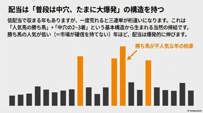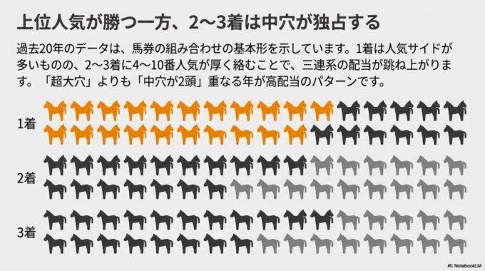 データが示す最も多い基本形は、「1頭は人気サイドの馬が軸になり、残りの2枠に中穴馬が入る」というパターンです。
