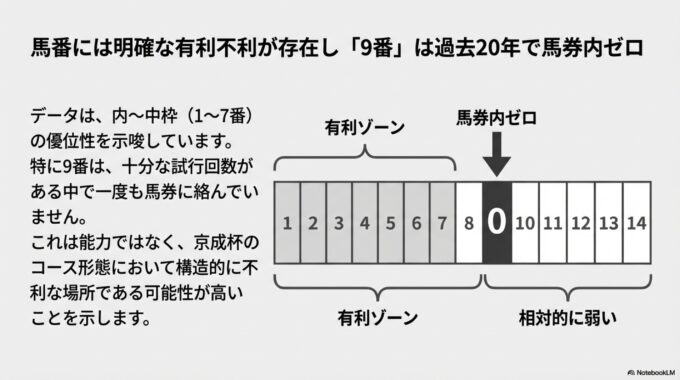 データ分析の中で、最も驚くべき事実がこれです。京成杯では過去20年間、9番ゲートに入った馬は一度も3着以内に入っていません。