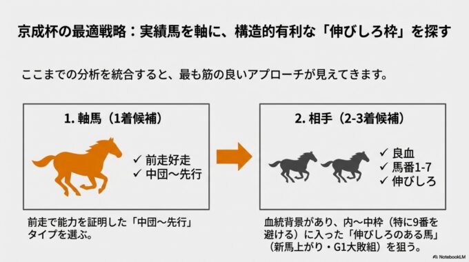 京成杯を攻略する鍵は、二元的な分析アプローチにあります。まず、1着候補として、人気サイドから完成度と再現性の高い馬を厳選する。次に、2~3着候補として、中穴の中から秘めたるポテンシャル、すなわち「伸びしろ」を持つ馬を探し出す。この組み合わせこそが、一貫して妙味ある配当を生み出しているのです。