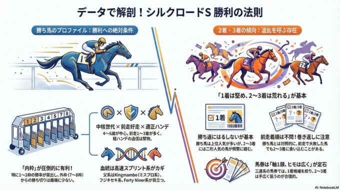 シルクロードステークスの馬券戦略を考える上で、最も重要なのが「1着馬」と「2〜3着馬」の傾向が大きく異なるという事実です。このレース特有の構造を理解することは、高配当を狙う上で不可欠な視点となります。データが示す基本構造は、「1着は比較的堅く、2〜3着は波乱含み」です。