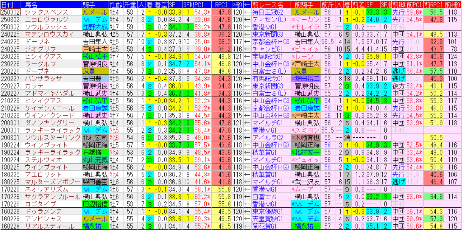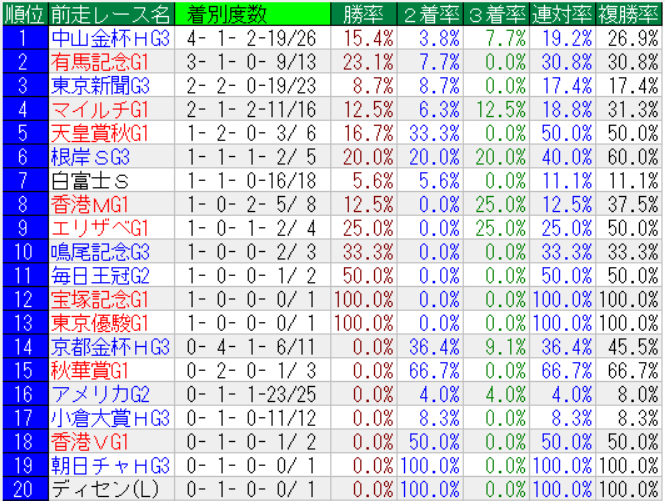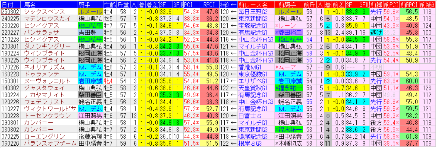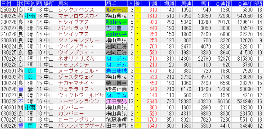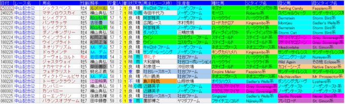 中山記念の過去20年の成績を集計し、1着馬の馬データ、1着馬の前走成績、前走レース別成績、血統別(種牡馬)成績、配当一覧など必見データ