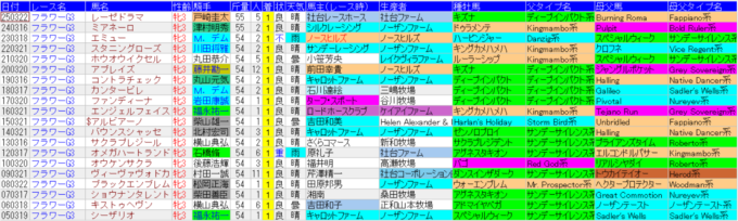 フラワーカップの過去20年の成績を集計し、1着馬の馬データ、1着馬の前走成績、前走レース別成績、血統別(種牡馬)成績、配当一覧など必見データ