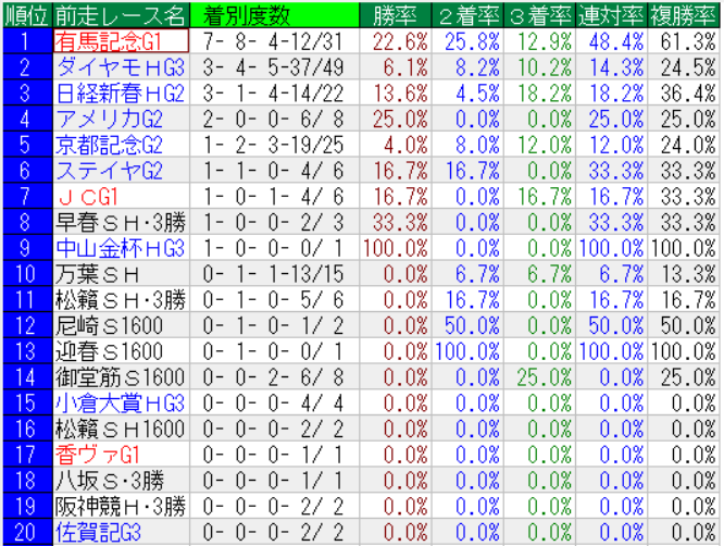 阪神大賞典の前走レース別成績(上位20位まで)