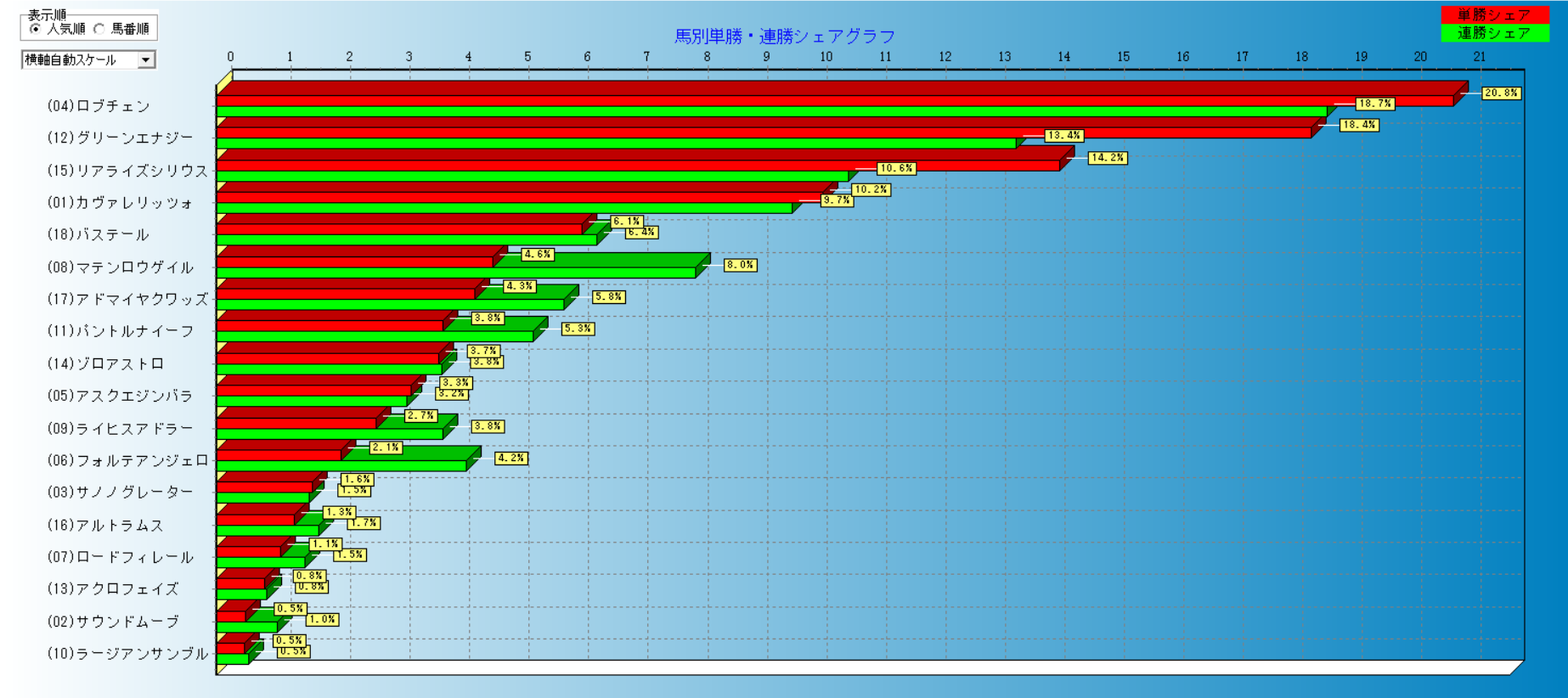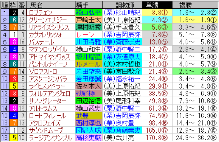 皐月賞2026 前売りオッズ 1人気ロブチェンで3.8倍、2人気グリーンエナジー4.3倍 レース情報 2026.04.17 レース情報 オッズ皐月賞 スポンサーリンク スポンサーリンク 皐月賞は金曜日から馬券を発売するので前売りオッズを取得してみました。 単勝人気を見ると1人気ロブチェン、2人気グリーンエナジー、3人気リアライズシリウス、4人気カヴァレリッツォでここまでが10倍以下でした。 複勝人気ではグリーンエナジー、ロブチェン、ゾロアストロ、マテンロウゲイル、リアライズシリウスの順でした 投票数が多くなると単勝と複勝の人気が連動してくると思います。