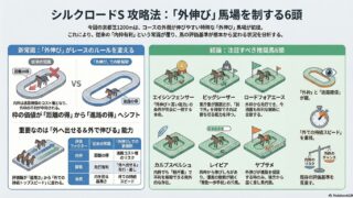シルクロードステークスは京都競馬場の芝1200mで行われる重賞レースだ。このコースの特徴は、スタート後すぐに上り坂があり、3コーナーまでの距離が約320mと短いこと。そのため、スタートダッシュの良さと序盤のポジション取りが重要になる。