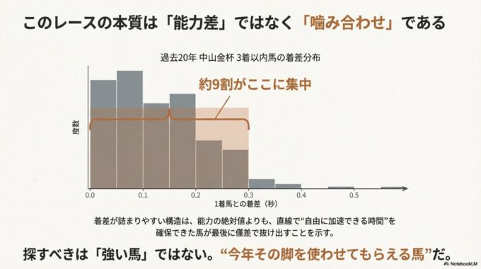 中山金杯を、過去20年のデータを徹底的に分析してわかったこと。それは、このレースは単純な「強い馬が勝つ」競争じゃないということ。むしろ、レース当日の展開や位置取り、そして「自由に加速できるタイミング」をどれだけ確保できるか。この「噛み合わせ」が勝敗を分けるんです。