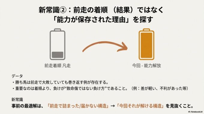 前走の着順という結果だけじゃなくて、「前走で詰まった構造が、今回は解ける構造になっているか」を見るんです。これが穴馬を見つける最大のヒントになります。