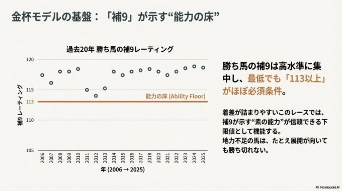 - 補9(能力):勝ち切るための絶対条件。この基準を満たさない馬は除外。