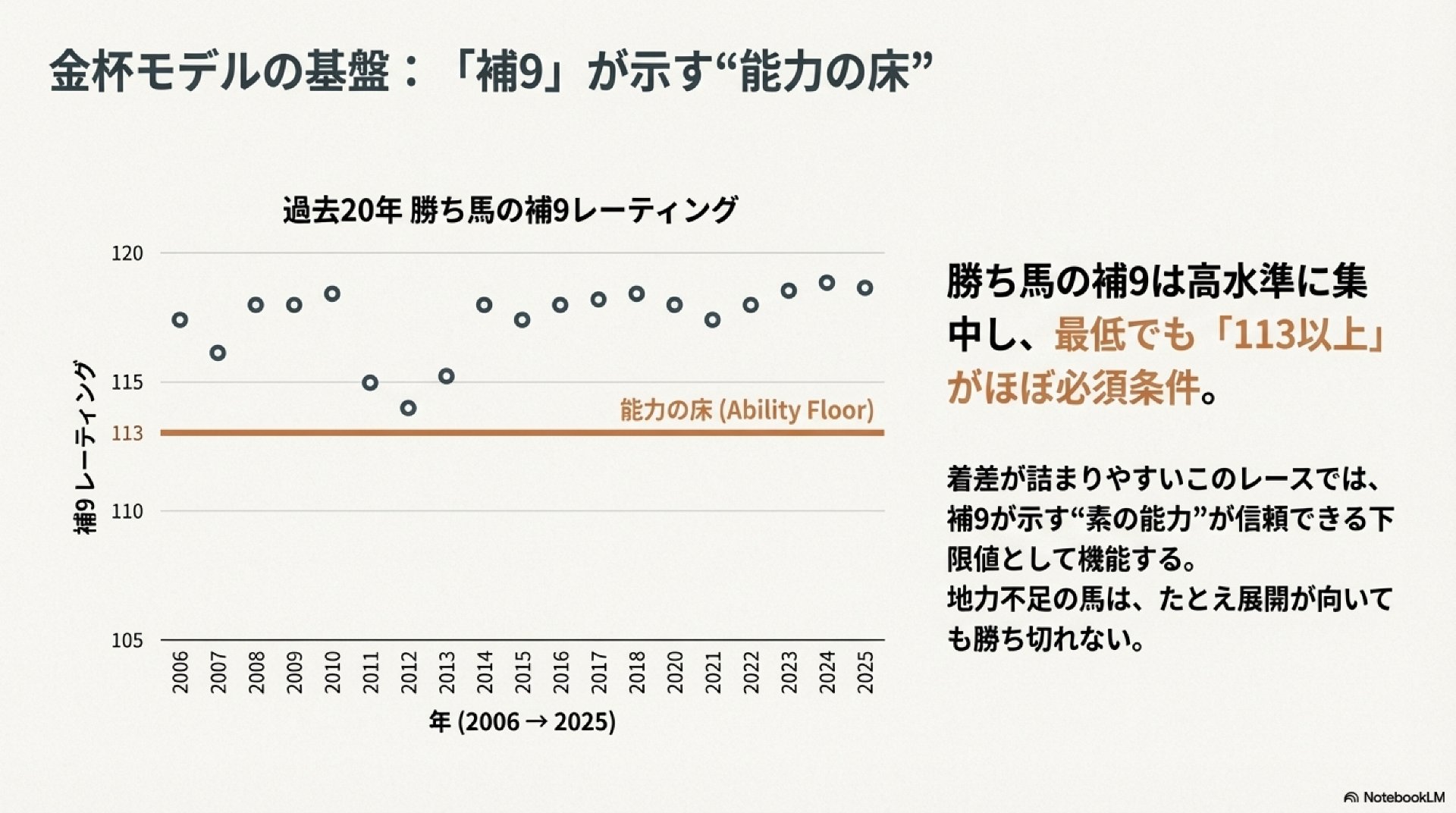 - 能力の床:勝ち切るには113以上の高い基礎能力が必要